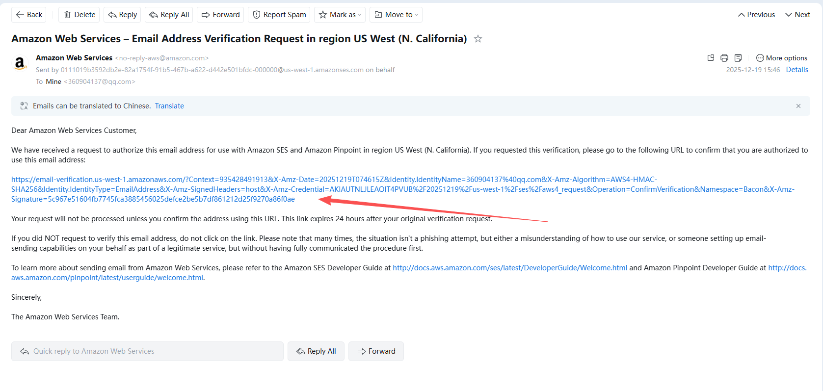 Go to your email inbox, find the email from Amazon Web Services, open it and click the verification URL.